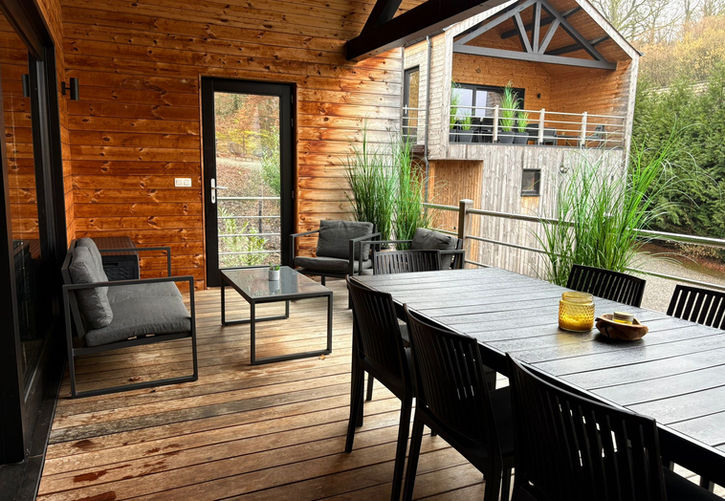 Groot, houten terras, overdekt met zicht op de straat, aansluitend bij de living